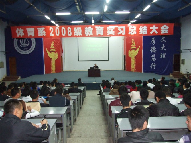 11月10日下午4:30,体育系2008级教育实习总结大会在莲湖校区126教室隆重举行。教务处科长曹红梅老师、体育系主任董立教授、党总支副书记佘涛老师、副主任陈碧述老师、办公室主任潘家礼老师、那明明辅导员、李进文、李文华等老师出席了此次会议。本次大会由系辅导员李霞老师主持,体育系08、09、10级近600名同学出席了大会。