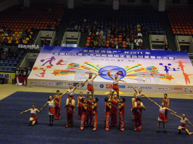 10月20日至23日,我系”喜洋洋“啦啦队”在孙亮亮老师、唐绪明教练的带领下,奔赴重庆铜梁参加2011年全国亿万青少年啦啦操规定套路明星展示大赛。本次大赛由国家体育总局体操运动管理中心举办的,有来自四川、广东、陕西等12个省市的70多支参赛队伍,1500多名运动员,欢聚铜梁,同台竞技。并有CCTV5、青海电视台、吉林电视台、重庆电视台等多家媒体现场直播和报道。中国国家体操奥运冠军杨威和陆斌也来到现场为运动员们加油鼓劲!